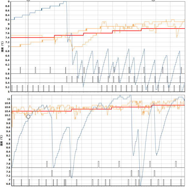 オレンジ折れ線はタンクの中間点と底部に近い醪の温度を測定制御しています。赤色折れ線はもろみ目標制御値を示しています。温度状況として底部の温度は冷却の影響を受けてやや低めの温度を示しながら徐々に醪温度が上昇します。一時的に冷えた醪の一部は温度の高い部分の冷却に寄与し時間の経過とともに均一性を示します。醪の中間温度は目標温度よりやや高めの温度傾向を示しながら制御されます。24時間の2点積算平均温度は目標温度に対して約0.1℃と高精度温度制御を可能としてます。